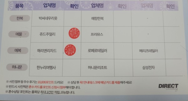 1. 박람회 입장 시 나누어 주는 혼수카드를 챙기자: 입장 시 혼잡해서 혼수카드를 챙기지 못하는 경우가 있다. 한복, 예물, 예복, 허니문 상담 시 혼수카드에 스티커를 붙여준다. 스티커를 붙인 혼수카드를 사진으로 찍어서 다이렉트 웨딩 카페 후기 작성 시 반드시 첨부해야 포인트 적립이 가능하다.